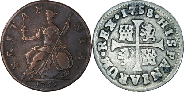 English and Spanish coins from the 17th & 18th centuries are often found near old settlements by metal detectors and others digging for constructions or other various reasons.