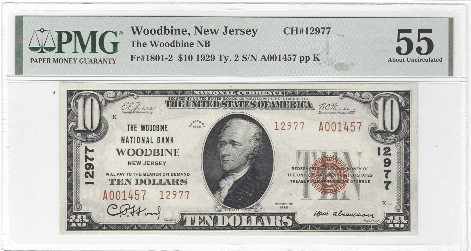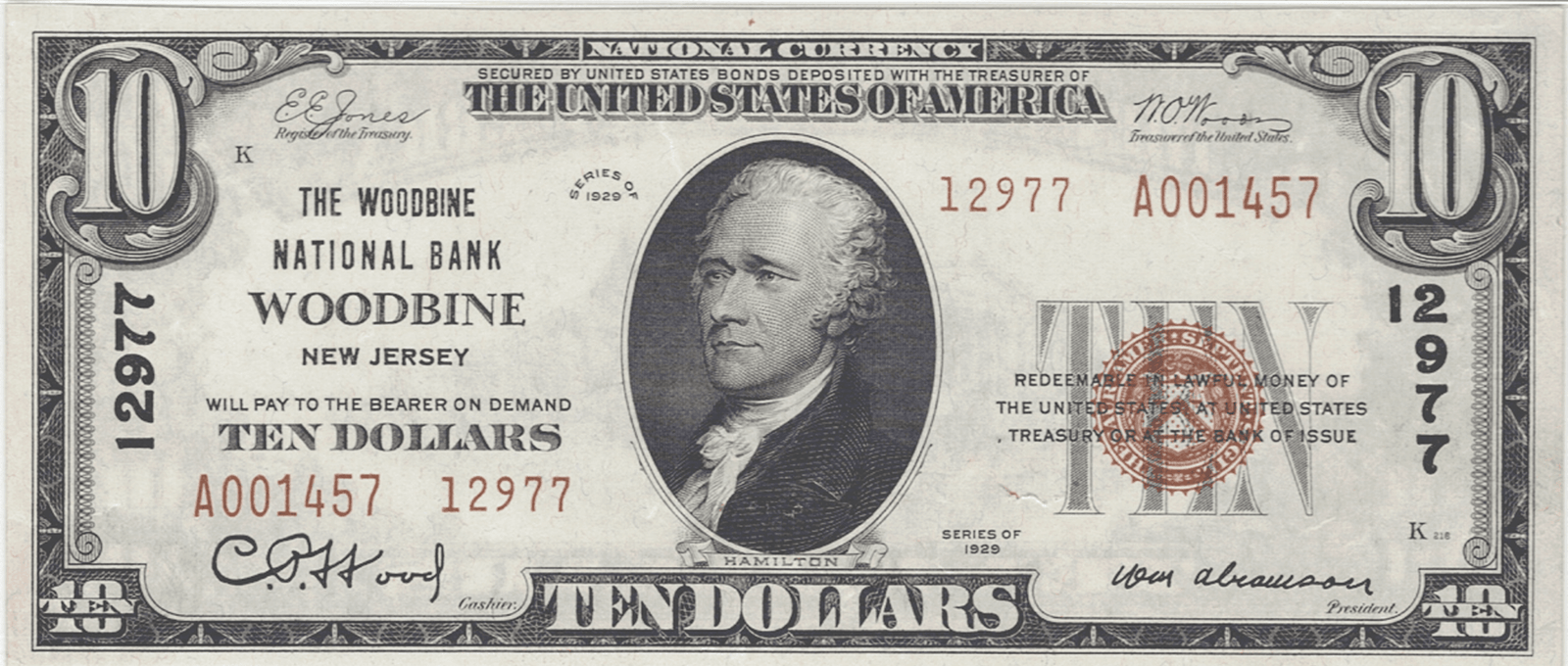 This rare $10 1929 series Woodbine NJ National Bank Charter 12977 note is a remarkable addition for any serious collector of local U.S. currency. Issued by the National Bank of Woodbine, New Jersey, this piece showcases a rich deep green ink combined with a classic design, reflecting the unique financial landscape of the era.