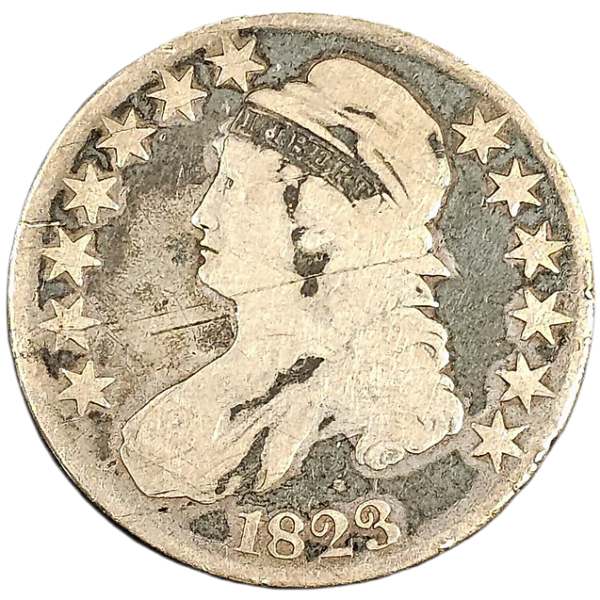 The 1823 capped bust half dollar is a notable type coin, valued for its historical significance and design. Although it grades no better than AG or G4, the charm of this piece remains undiminished.