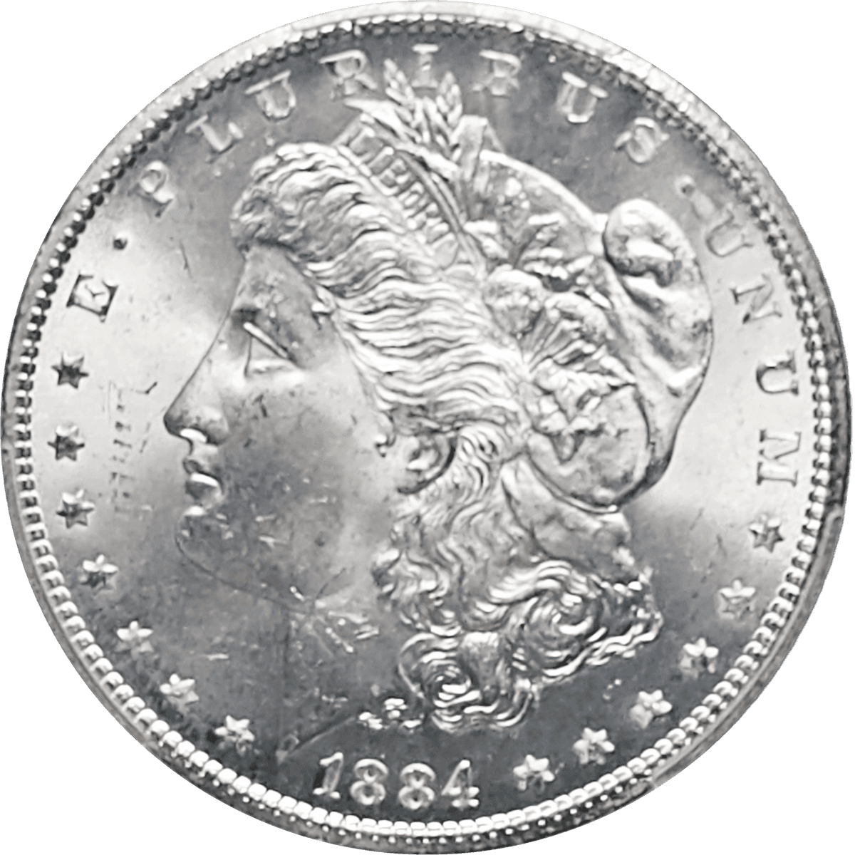 The 1884 Morgan dollar is one of the most collected United States coin with a reeded edge. It contains 0.7734 troy ounces (24.5 g) of silver or precisely 90% of the total coin weight of 0.8594 troy ounces (26.73 g). The diameter is 1.50 inches (38.10 mm), while the thickness is 0.0945 inches (2.40 mm).