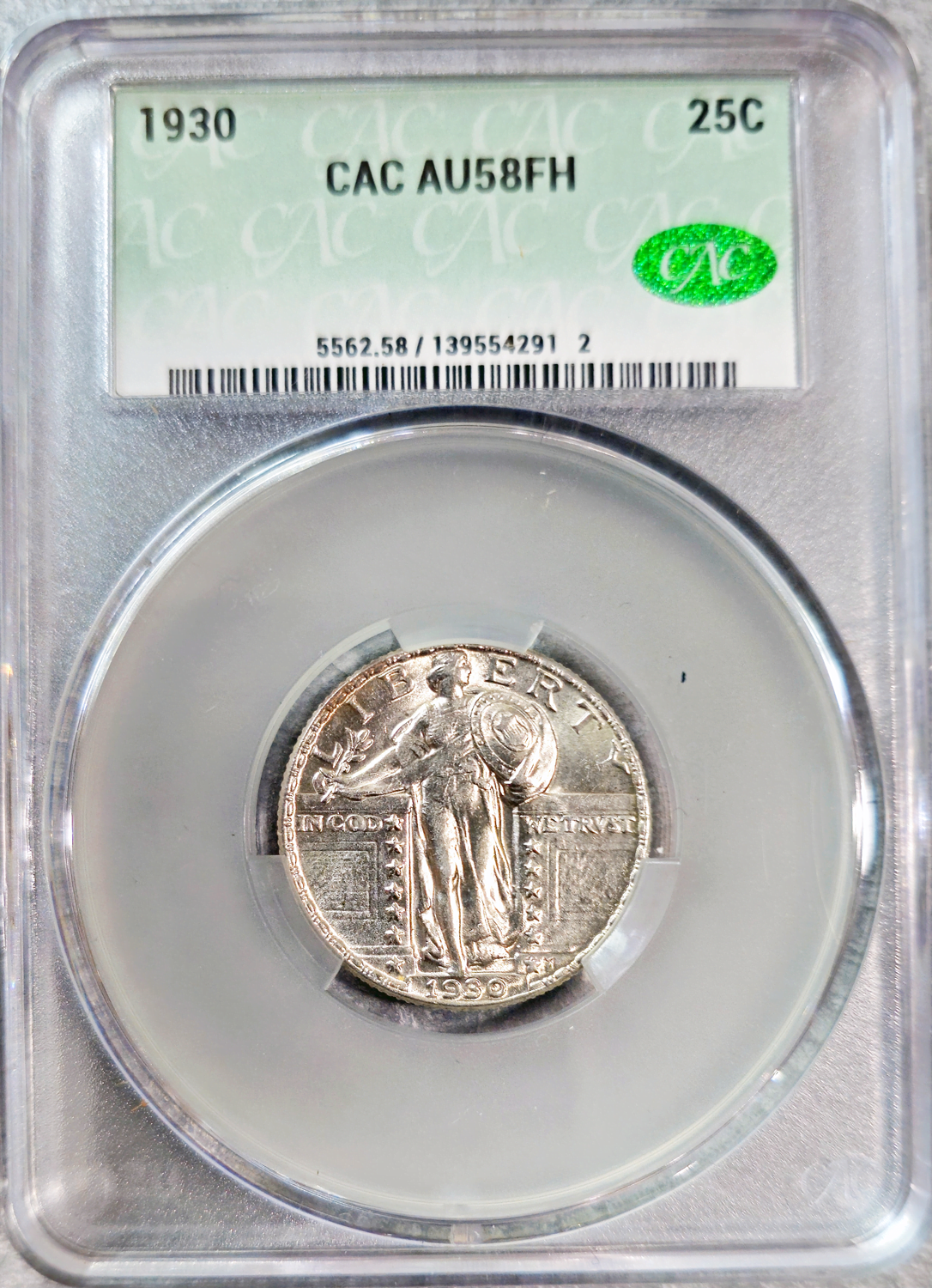 This particular 1930 quarter has been rigorously certified and graded AU58 Full Head by CACG. Such a grade denotes a high-quality condition, showcasing only minor wear and brilliant luster, making it a valuable addition to any collection.