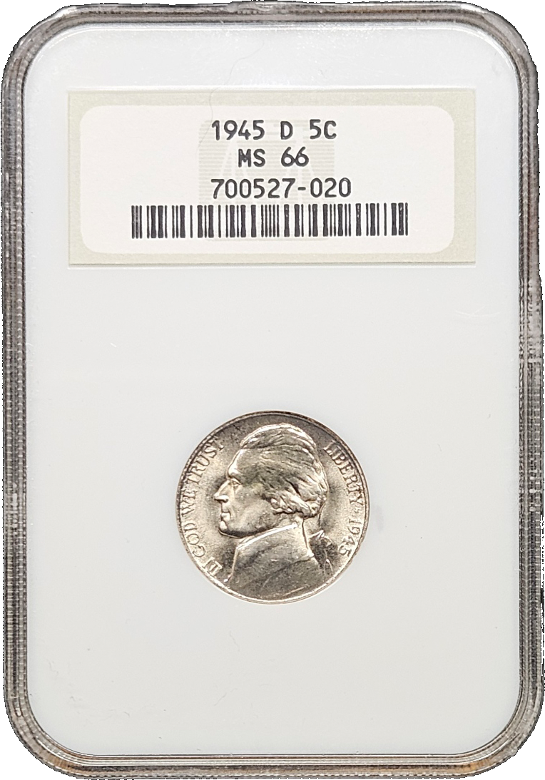 Discover a remarkable piece of numismatic history with the 1945 D Jefferson War Nickel, certified MS66 by NGC and preserved in an iconic old-style holder. This wartime nickel is not just a collectible artifact but also a fine representation of the craftsmanship and resilience of the World War II era. As an MS66-grade coin, it boasts exceptional quality, with pristine surfaces and sharp details that will captivate both seasoned collectors and beginners alike.