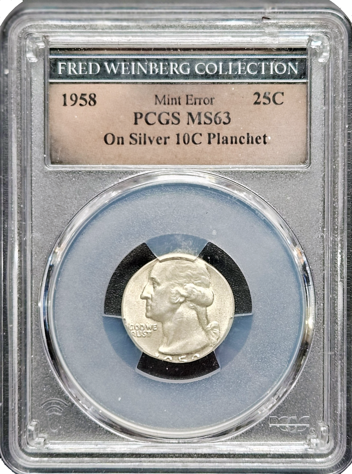 Rare 1958 Quarter Struck on Silver Dime Planchet PCGS MS63