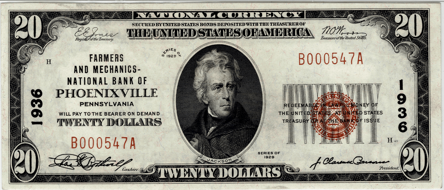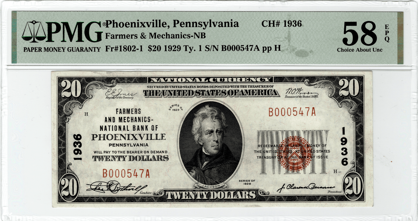 Explore the $20 1929 series Phoenixville PA National Bank note, charter 1936, serial 547a. This exceptional piece, available for display at Key Numismatics, holds significant historical value. PCGS AU58 EPQ