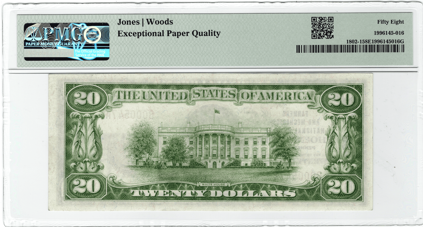 Discover a rare piece of American history with the $20 1929 Series Phoenixville, PA National Bank Charter 1936, serial 547A. This unique note is a certified treasure, verified by PMG as Choice 58 EPQ, ensuring its quality and authenticity.