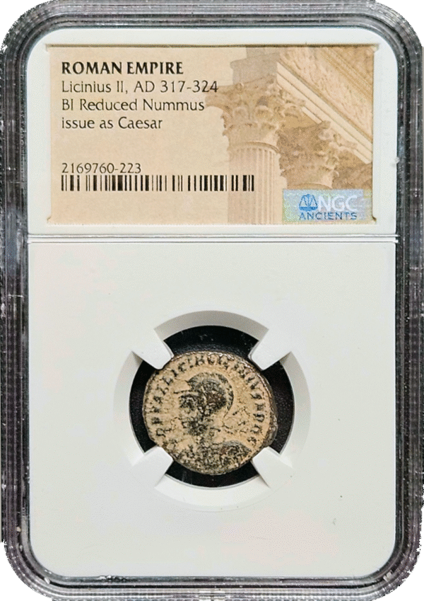 Unveiling an exquisite piece of Roman history, the Licinius II Reduced Nummus stands as a remarkable artifact from an era marked by imperial power and historical significance. This coin, issued during Licinius II’s tenure as Caesar between AD 317 to AD 324, reflects the rich legacy of a young ruler who held a prominent role in the Roman Empire alongside his father, Licinius I. Carefully preserved with a verified NGC grade, it is a true treasure for collectors and enthusiasts of ancient numismatics.