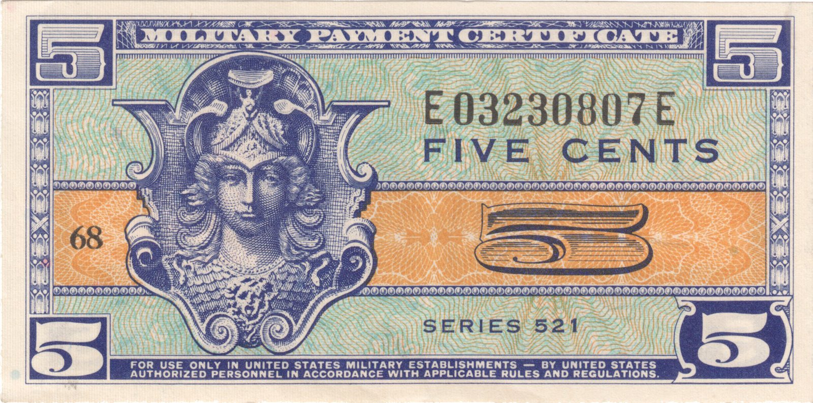 Step into a moment of history with the Five Cent Military Payment Certificate Series 521, a collectible item cherished by enthusiasts and historians alike. Issued between 1954 and 1958, this military payment certificate (MPC) was part of a specialized system created exclusively for U.S. military personnel overseas. Its designation as FR.-M29 in the renowned Friedberg catalog system highlights its unique attributes and significance among collectors.
