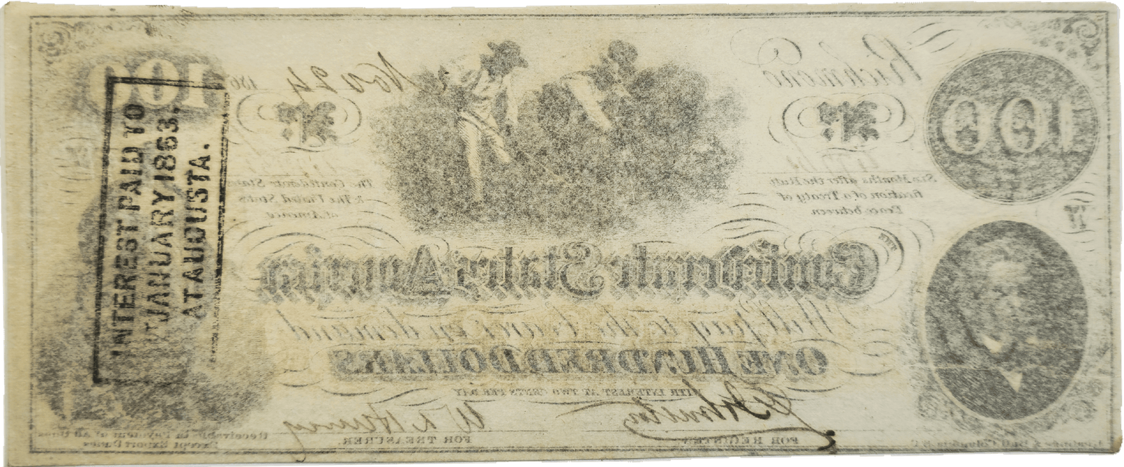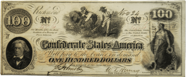 This historic piece of currency, 1862 Confederate States of America $100 Note, T41 features intricate design elements that are unique to the Confederate States during the Civil War era.