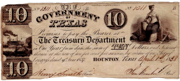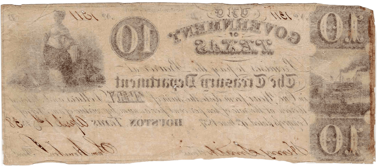 This historic, early piece of currency is a actually a Treasury warrant issued in Houston by the Government of Texas. The note is payable in dollars of the Republic of Texas. The note is bordered on all sides by imprinted lines. The left edge of the note contains the imprinted image of a steamship with ’10’ imprinted above and below.