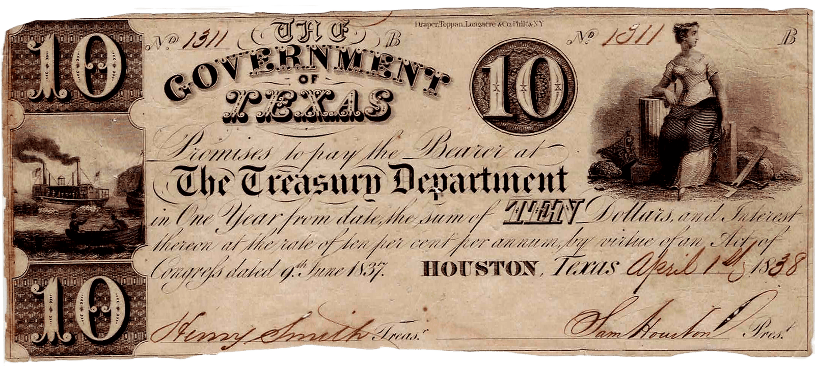 Offering a Ten Dollar Note of The Republic Of Texas featuring the Secretarial Signature of Sam Houston as well as Treasurer Henry Smith.