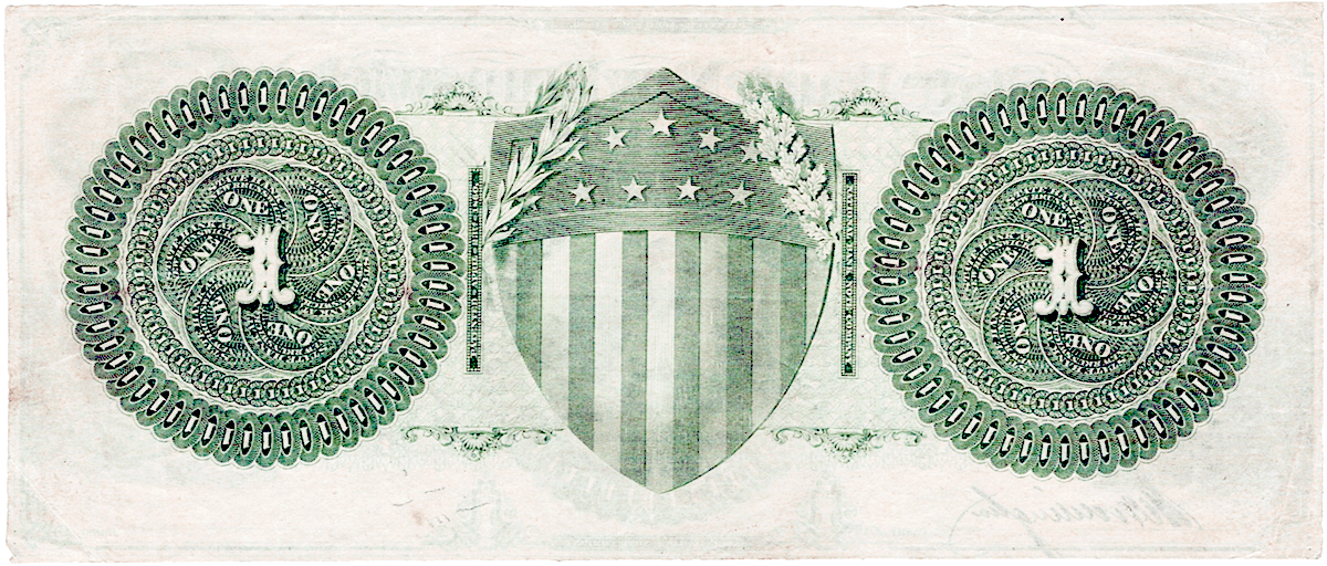 The bill is in pristine condition with no folds, pinholes, bad edges or corners. It is well centered with thin but crisp paper. A large bill at 7.25″ X 3 1/16″ it is not a rarity but it is a beautiful design on both sides. Signed by a cashier getting a jump on his job, we suppose.