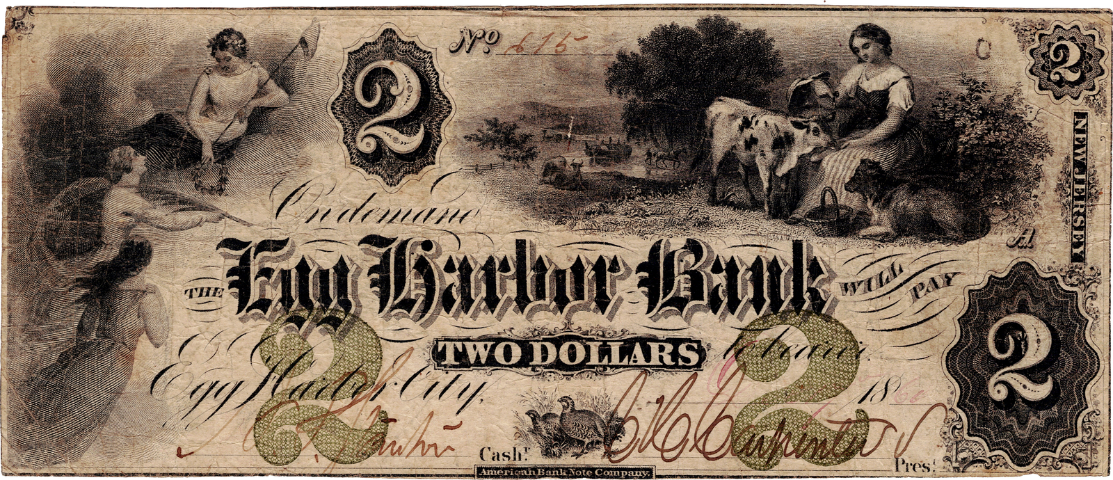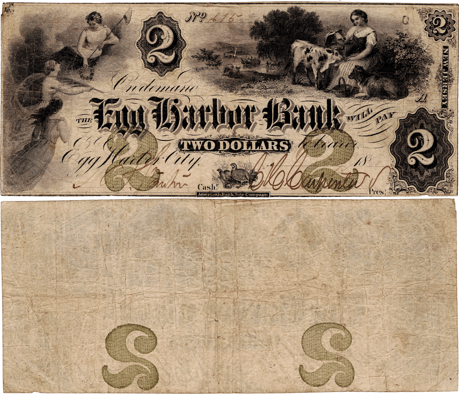 1861 Egg Harbor Bank Egg Harbor City New Jersey $2 Note featuring several vignettes. Liberty and two other goddesses at left, the denomination($2) adjacent, a woman feeding a calf at top center and people fording a river behind her. At bottom center a covey of quail. Two green overprints “2” at the bottom is added as an anti-counterfeiting measure and comes through the back of the note. Serial number 675. We believe it is dated sometime in 1860 but the date, in red ink, is light and hand written through one of the large green twos.
