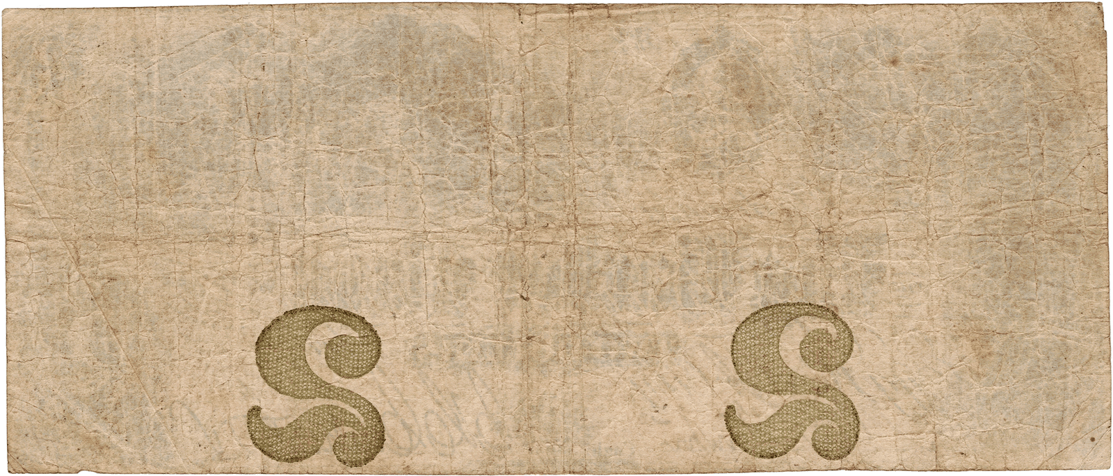 This bank had a short lifespan. It opened it’s doors in 1860 and closed late 1861. This bill is in very fine condition with a light vertical fold center, some pinholes, a slightly off upper left corner and a couple small edge indents. It is well centered with thin but fairly crisp paper. A large bill at 7″ X 3″.