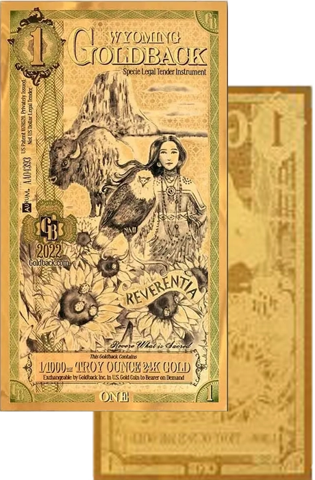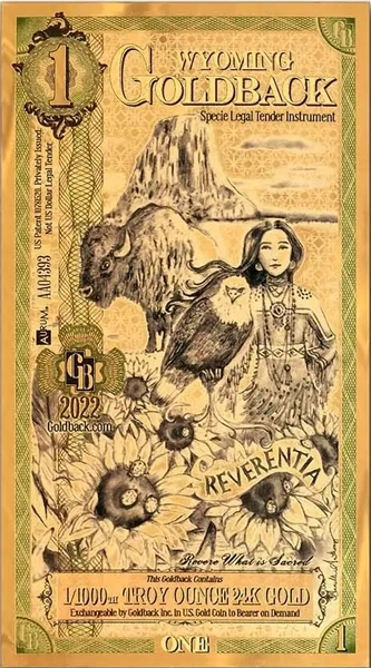 In 2023, the Wyoming $1 Goldback gold note emerges as a remarkable local currency, uniquely crafted with precision. This gold note contains 1/1000 oz of .999 fine gold, making it both an aesthetic treat and a valuable asset.
