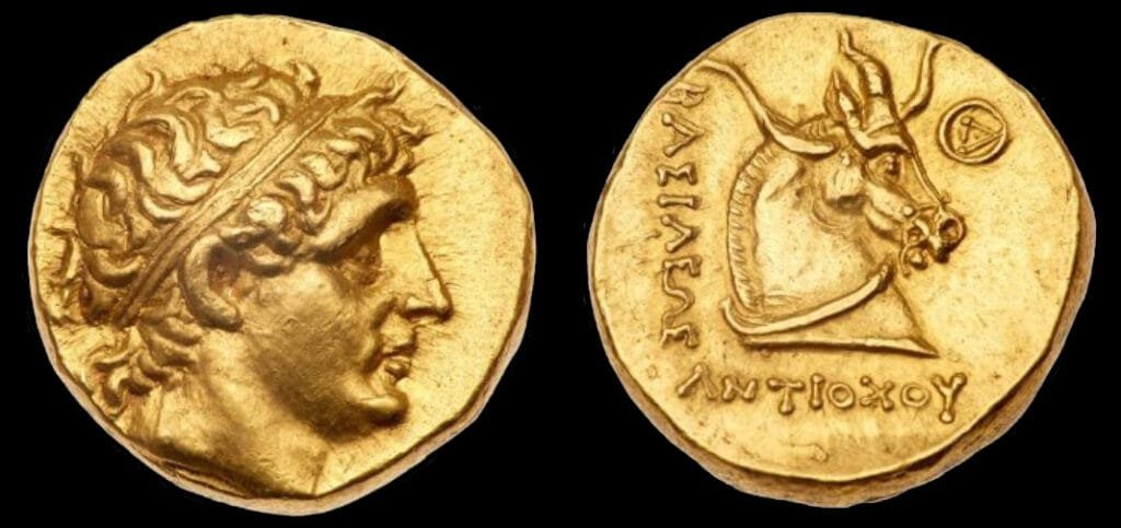 Circa 564-539 B.C. on behalf of King Kroisos of Lydia, the ancient Greek coin is the first gold coin known to be made by man.